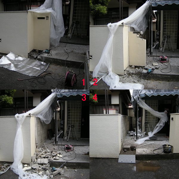 門柱の撤去 コンクリブロックに塗装をした玄関先門柱の解体撤去を承りました。 見積りは、事前にデジカメ画像をご提供頂けましたので、助かりました。 作業は、初めにグラインダーで境界塀との間に切込みを入れて、大金槌と電動ハンマーで砕きました。
